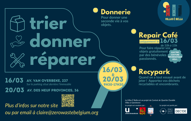 Dans le cadre du projet La Villa È Bella que nous menons pour le contrat de quartier Villas à Ganshoren, nous organisons deux grandes donneries ouvertes à toutes et tous à l’occasion des Recyparks Mobiles de Bruxelles Propreté/ABP.