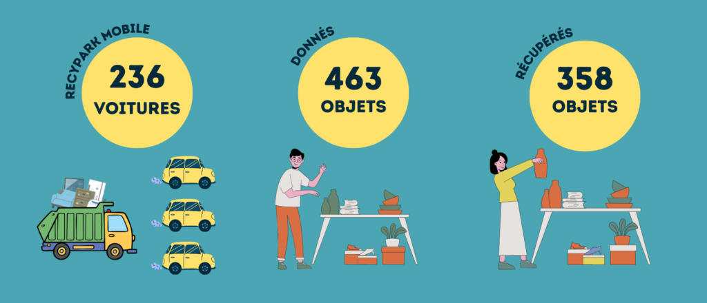 Quelques chiffres, récoltés lors du Re-Use Corner du 16 mars 2026, illustrent concrètement cette dynamique : 236 voitures se sont présentées pour jeter leurs encombrants au Recypark Mobile, dont 76 personnes ont contribué au Re-use Corner, avec un total de 463 objets donnés. Du côté de la récupération, 79 personnes sont reparties avec 358 objets déposés plutôt dans la journée, leur offrant ainsi une seconde vie. Parallèlement, 5 containers ont été remplis, montrant à la fois l’importance des flux de déchets et le potentiel du réemploi pour en détourner une partie.